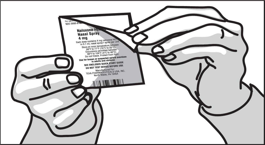 Lay the person on their back to receive a dose of Teva’s Naloxone HCl Nasal Spray. Remove Teva’s Naloxone HCl Nasal Spray from the box. Peel back the tab with the circle to open Teva’s Naloxone HCl Nasal Spray.